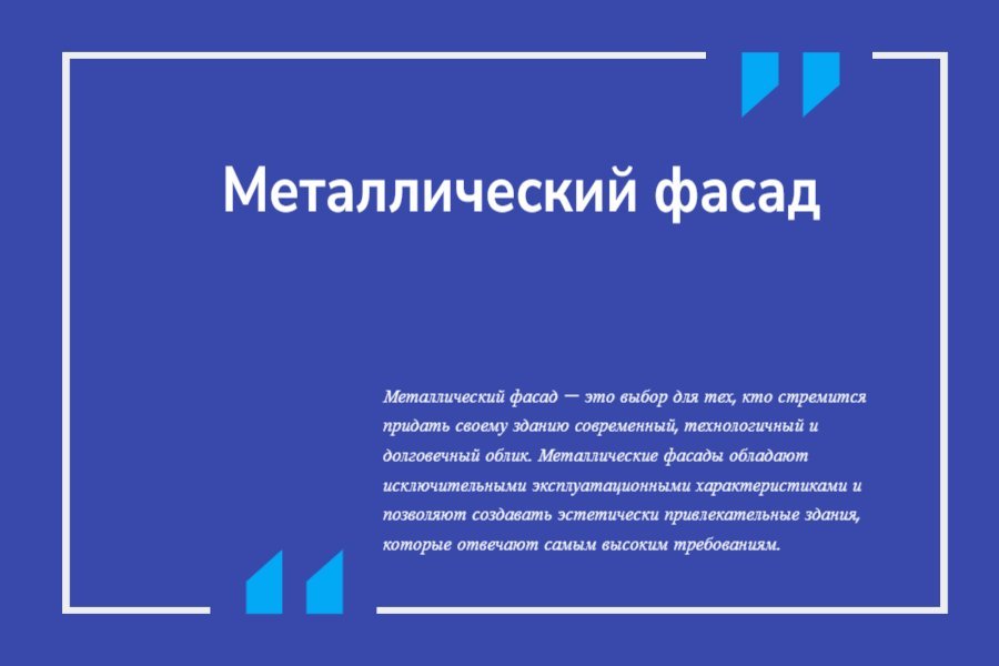 Металлический фасад — это выбор для тех, кто стремится придать своему зданию современный, технологичный и долговечный облик. Металлические фасады обладают исключительными эксплуатационными характеристиками и позволяют создавать эстетически привлекательные здания, которые отвечают самым высоким требованиям.
